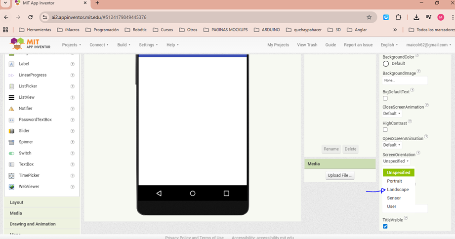 Descargado el material, lo primero que haremos será subir la imagen a nuestra app, vamos a desplazar un poco hacia abajo y ubicamos la opción “Media” y luego hacemos clic en el botón “Upload File” esto abrirá una ventana flotante allí nos permitirá selecciona la imagen a cargar la seleccionamos y le damos “OK” esto proceso se hace de uno en uno, es decir no podemos cargar varias imágenes en un mismo momento.