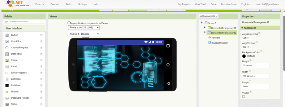 En la categoría “user interface” buscaremos el componente “notifier” lo seleccionamos y lo llevamos a la mitad de la pantalla, como se puede ver no se ve ningun cambio en el diseño pero si nos desplazamos un poco hacia abajo, debajo del teléfono aparece nuestro componente y este nos dice que no es visible, dicho componente nos va a permitir mostrar información en formato de alerta.