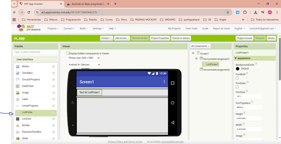 Bien, ahora vamos a iniciar con la ubicación de los botones en el primer layout, en la categoría “user interface” van a seleccionar el componente “list picker”
