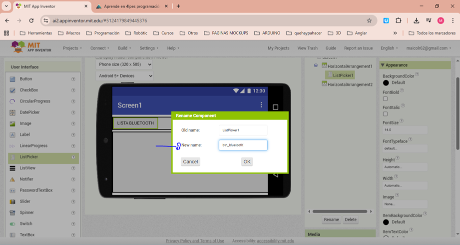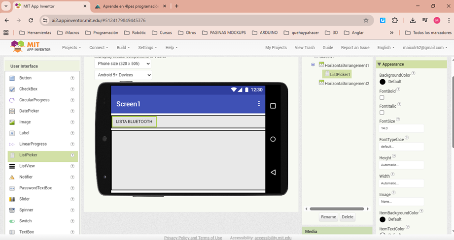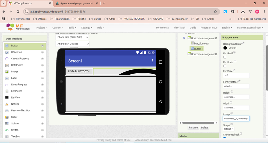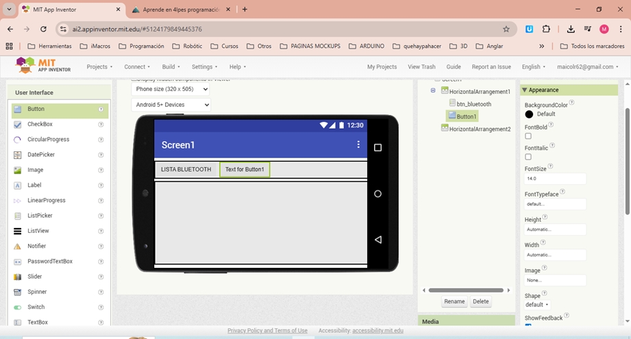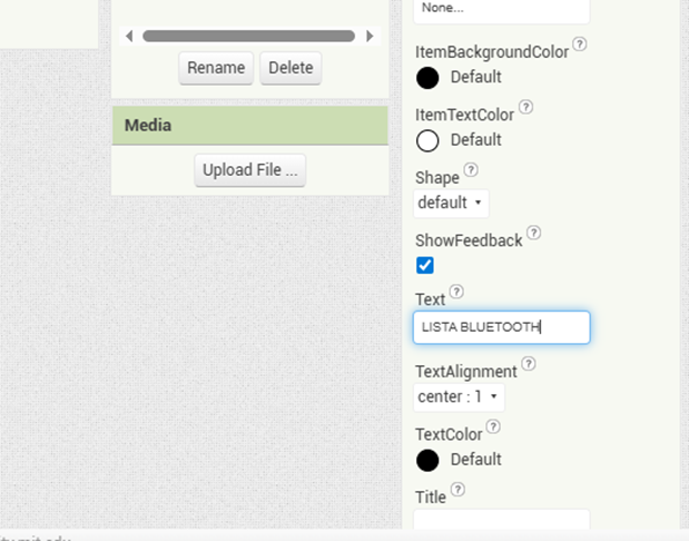 Este será nuestro botón con lista que usaremos para mostrar el listado de dispositivos con bluetooth cercanos a nuestra ubicación, seleccionamos el componente haciendo clic y vamos a modificar el nombre de los componentes yendo a la propiedad de “Text” borramos el contenido y colocamos “LISTA BLUETOOTH”.