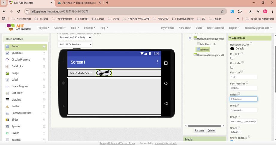 Ahora seleccionamos nuevamente el botón y vamos a ir a la sección 3 y ubicamos el botón que dice “rename” esto abrirá una ventana flotante allí modificaremos el nombre del botón y lo llamaremos “btn_bluetooth” esto para identificarlo más rápido al momento de la programación. Vamos a modificar su propiedad de “Width” donde seleccionamos la opción “percent” y le damos un valor de 20 y en “Height” le marcamos la opción de “fill parent”.