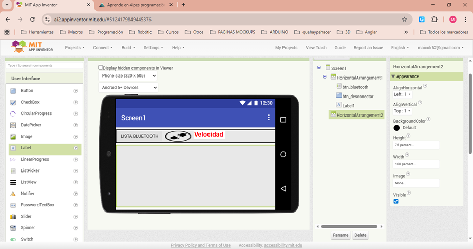 Continuamos, ahora colocaremos un componente “label” seguido del botón “btn_desconectar”, a esta etiqueta le modificaremos la propiedad de “Text” y se colocaremos “Velocidad” ajustaremos el tamaño de la letra yendo a la propiedad “fontSize” y le pondremos en 129 y le daremos al fondo un color blanco yendo a la propiedad “backgroundColor” y al texto yendo a la propiedad “TextColor” seleccionaremos el color rojo.