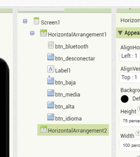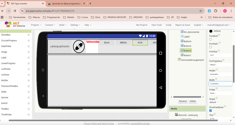 En la parte 1, vamos a colocar dos componentes de tipo “button”, a estos van a cargar la imágenes de flecha arriba y abajo y les colocan la imagen, este proceso ya se realizó con el botón de desconectar.