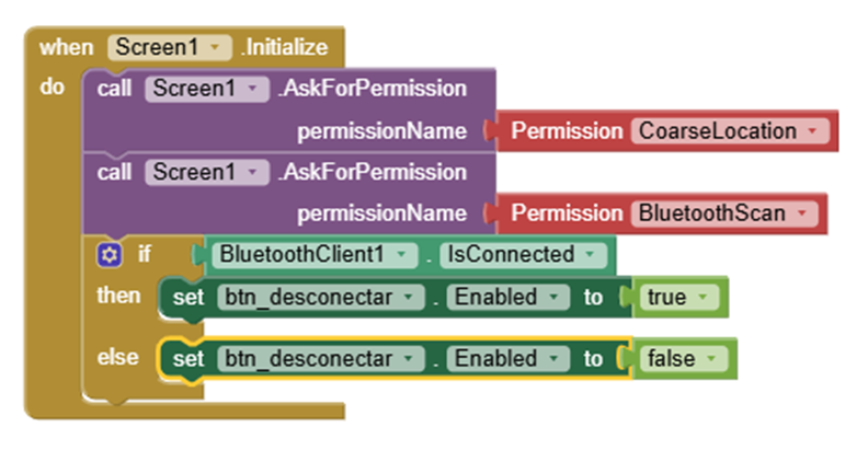Listo ahora lo que haremos será agregar unas validaciones, tenemos un botón para conexión a bluetooth y otro para desconectar, entonces si no estamos conectados a un dispositivo lo que haremos será decir que el botón de desconectar debe estar inactivo (es decir que no podrá hacer clic ni enviar una solicitud) y esto lo hacemos agregando los siguientes bloques: