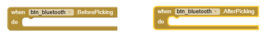 Ahora vamos a programar nuestro “listpicker” el cual llamamos btn_bluetooth, vamos al apartado “blocks” y buscamos estos componentes y observarnos que bloques nos muestra este componente. De ese listado de bloques vamos a seleccionar dos “AfterPicking” y “BeforePicking” que se traduce antes de clickquear y después de haber clickeado.