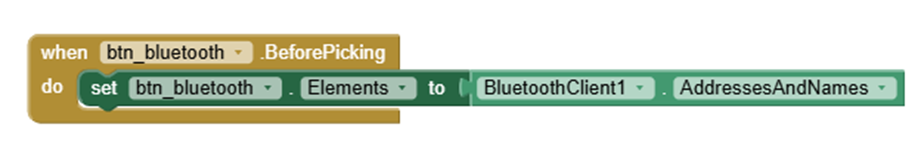 En beforePicking vamos nuevamente a los bloques de nuestro “btn_bluetooth” y buscamos el siguiente bloque: “Set btn_bluetooth . Elements” y lo colocamos dentro de nuestro bloque beforepicking. Nuevamente volvemos a nuestros bloques y ahora buscamos el componente BluetoothClient1 y buscamos el bloque que dice “BluetoothClient1 . AddressesAndName”