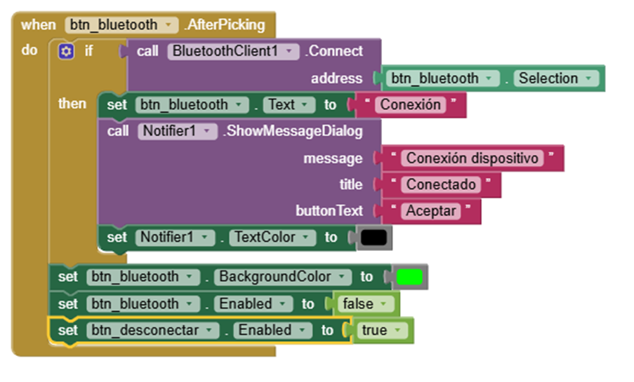 Bien lo que estamos diciendo básicamente es evaluar si se realizó la selección de un dispositivo y si se logro la conexión, si dicha conexión fue exitosa nos muestra una alerta de confirmación y nos inactiva el btn_connect y se nos activa el btn_desconectar.