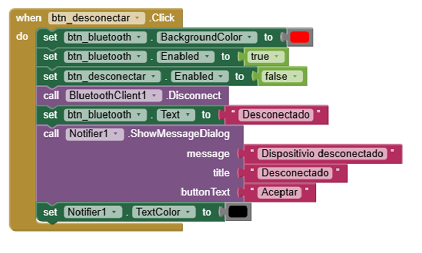 Al hacer clic en el botón de desconectar, lo que haremos será primero desconectar nuestro dispositivo de bluetooth y luego activaremos el boton btn_bluetooth e inactivaremos el botón btn_desconectar y enviamos una alerta de información mediante el componente “notifier”.