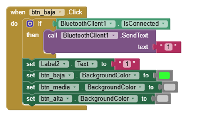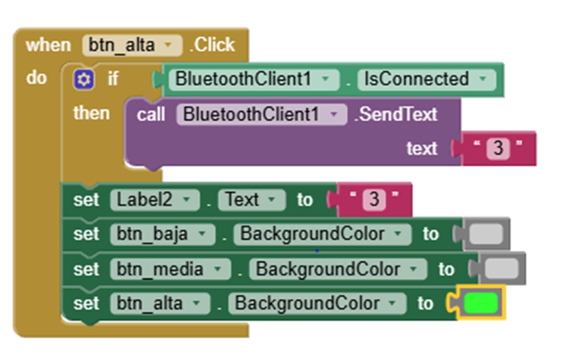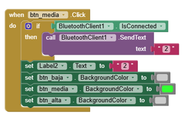 Este fragmento lo que hace es verificar si existe una conexión mediante bluetooth si la conexión existe entonces envía el valor “1”, pero si la conexión no existe el valor no se envia, luego para diferenciar a que velocidad esta el robot, le decir que el boton se coloque de color verde y los demás de color gris. Este proceso se repite para los botones btn_media y btn_alta pero enviando el valor de 2 y 3.