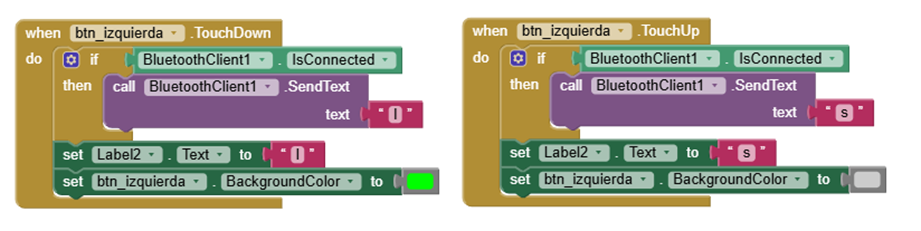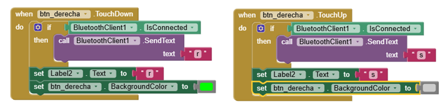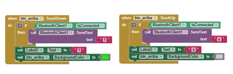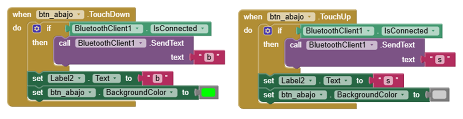 Para cada uno vamos a buscar el bloque “when btn_arriba TouchDown” y también el “when btn_arriba TouchUp”: