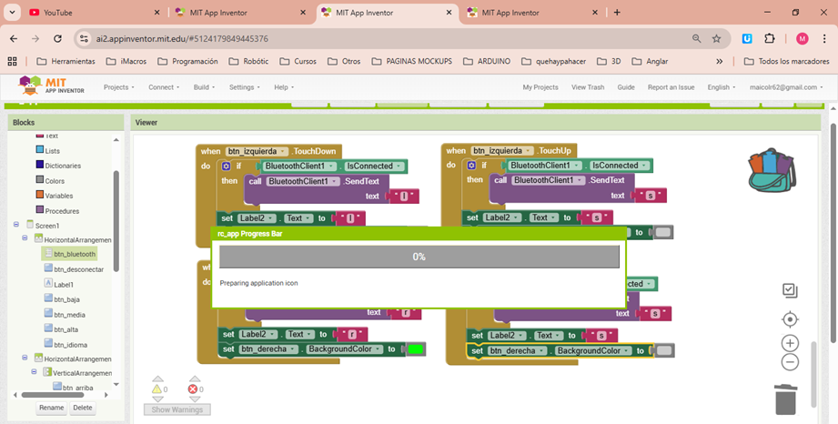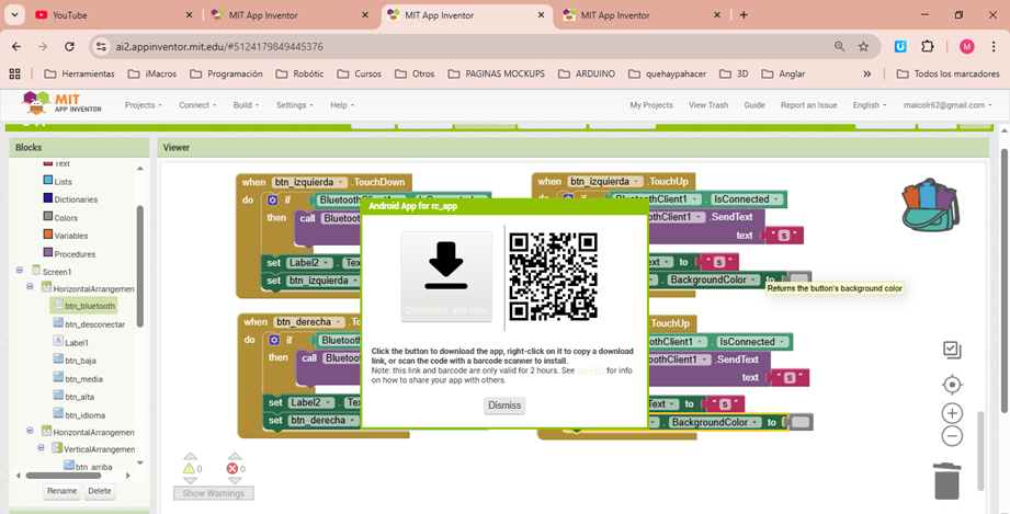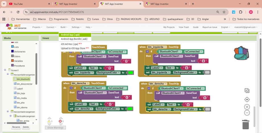 Bien con esto hemos logrado ya programar cada acción principal de nuestro botones, los necesarios para el control de un robot, ahora lo que haremos será generar nuestro apk, esto lo logramos yendo al menú superior dando clic en la opción “build” y seleccionando la opción “AndroidApp (apk)” esto iniciará a preparar nuestra aplicación y luego podremos descargarla e instalarla en nuestros dispositivos android.