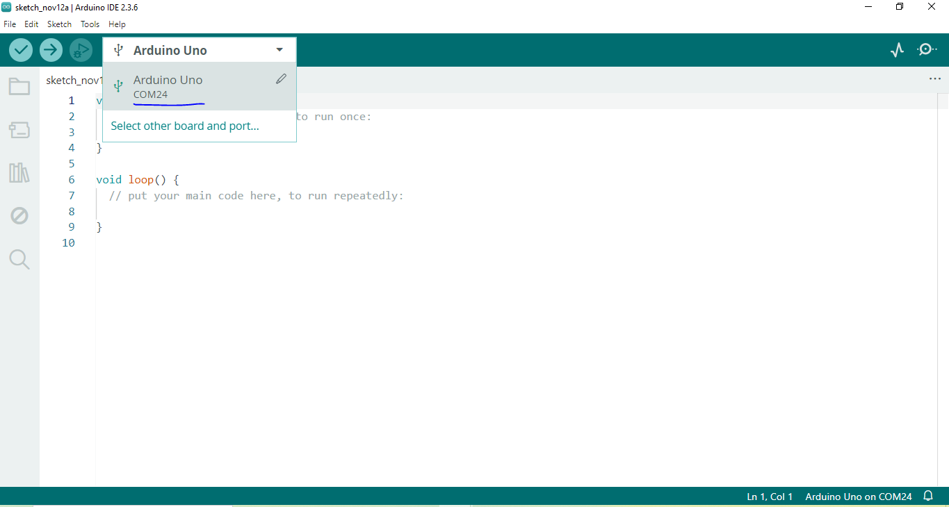- Selecciona el puerto COM que corresponde a tu Arduino, haciendo clic en la lista desplegable buscamos el puerto identificado el paso 1
