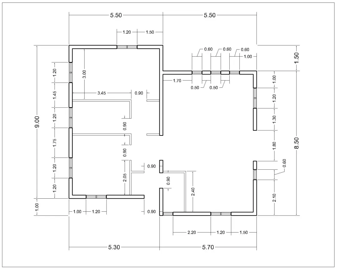 Diseñar el plano en 2D de una casa de una sola planta utilizando LibreCAD. El plano debe incluir las siguientes capas:
