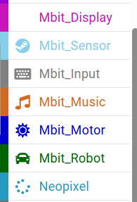 Vamos a explorar la categoría denominada Mbit_robot, allí podremos encontrar funcionalidades que nos permitirán controlar los motores de nuestro prototipo robótico, recuerden que previamente ya deben de tener armado un robot de todos los diseños que nos brinda el kit.