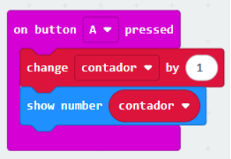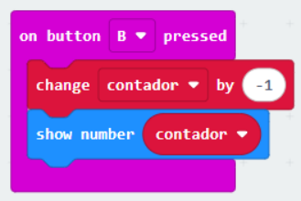 Lo que buscamos hacer en este tutorial es que al pulsar el botón A la variable contador incremente de 1 en 1 de acuerdo a la cantidad de veces que se pulse dicho botón, y que al pulsar el botón B el lugar de incrementar lo que queremos lograr es que dicho valor disminuya, para ello vamos a usar los siguientes bloques: